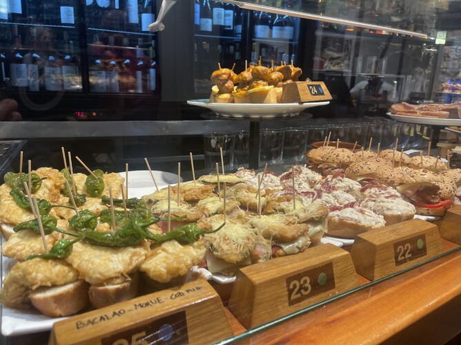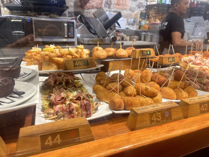 We found pintxos (Basque tapas, traditional food in the region) for a late lunch / dinner. Some are better than others.