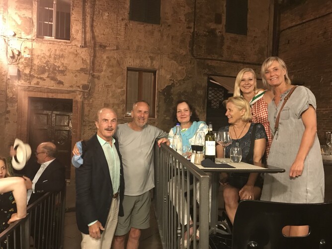 From left to right - Bryant, Bill, Rebecca, me, Karen directly behind me and Katarina. Nice to make new friends, and we chatted about the Palio and life. Rebecca and Bryant (NY State), Karen (Florida, though now a pilgrim working everywhere - check her out online - Karen Rauch Carter, best selling feng shui author), and Katarina from Sweden.
