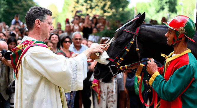 Then early in the afternoon all horses go to get blessed in their contrade chapels or outside it. (This depends whether the chapel has steps to it or not.) The jockey/fantini attends a blessing ceremony for himself and his horse, where the contrade priest presses a golden figure between the horse's eyes as he recites a prayer. We went to see Oca's horse blessed. (This photo is from the internet from another year, we didn't get very close.)