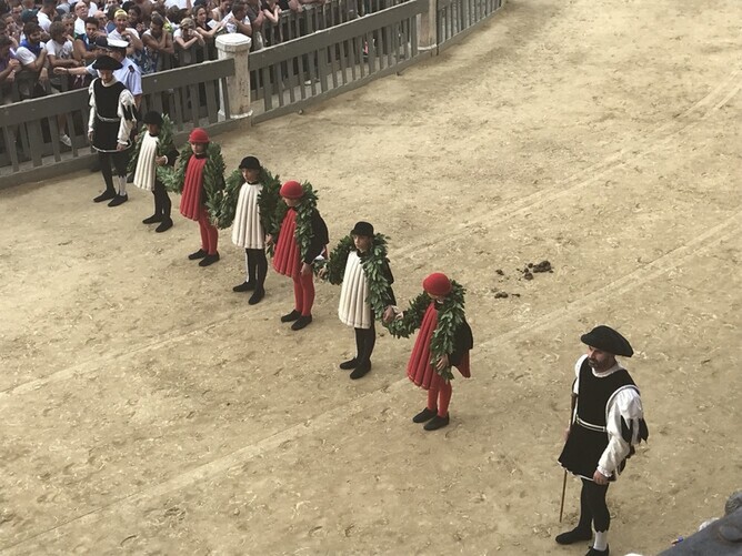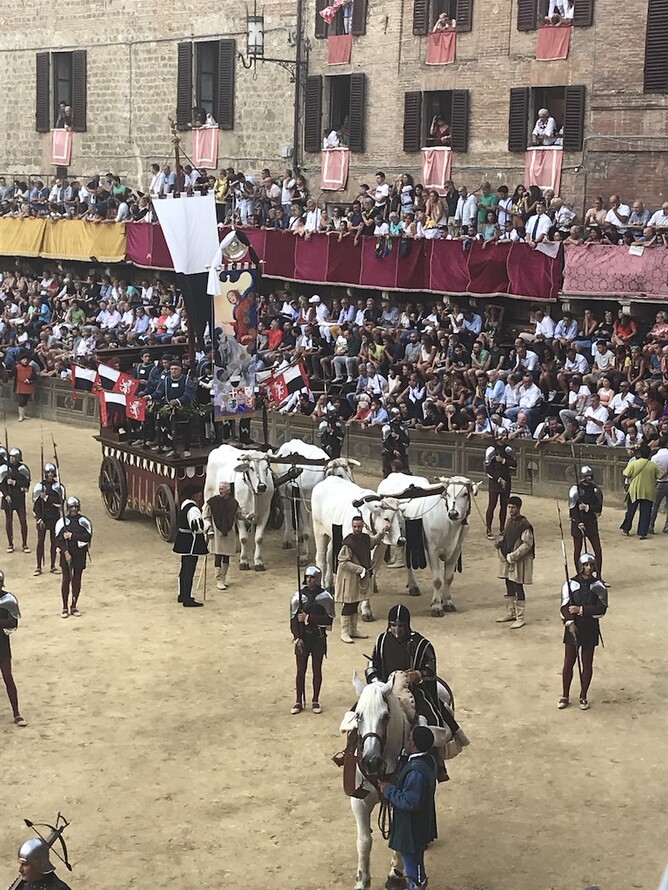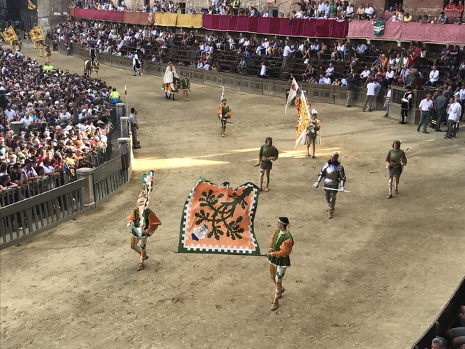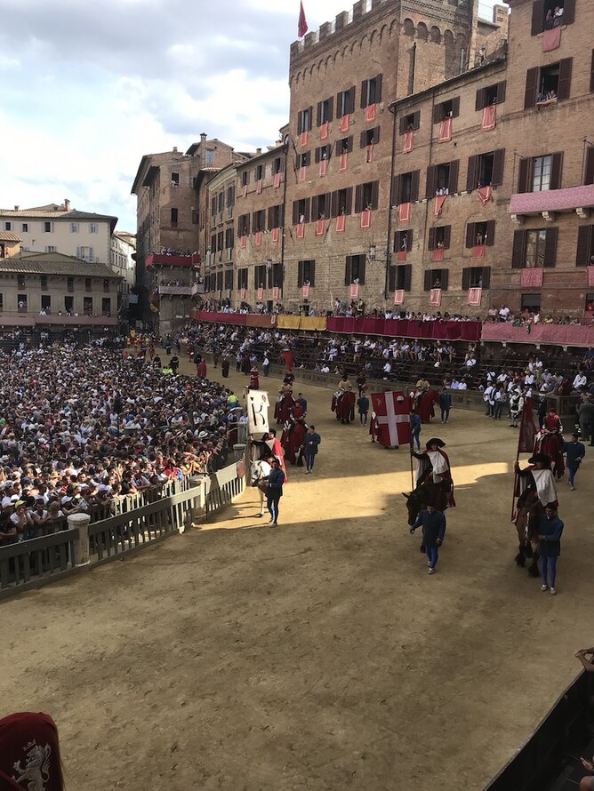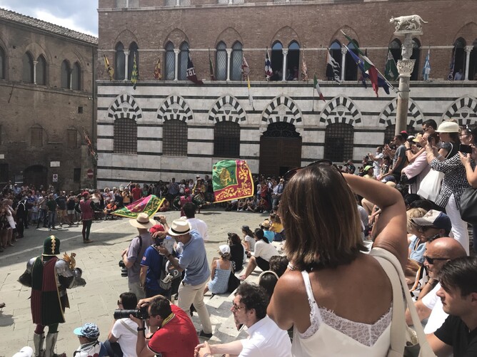 From Wikipedia: "The Corteo Storico is a historical costume parade has always occurred before the Palio since the race’s inception. It is a formally choreographed triumphal march that commemorates the ancient institutions, customs and greatness of the Republic of Siena. Special attention is given to the Contrade whose participants form the main part of the parade. The parade takes place in the Piazza del Campo with 14 groups and a total of almost seven hundred participants. The procession enters the Piazza del Campo on the first toll of the bell (the "Sunto") on the Torre del Mangia. (By the way this bell is one of the few times this is rung.) Ten pairs of Ensigns stop at the various points in the Piazza and in synchrony with the drum roll perform a spectacular flag-waving exhibition culminating with the throwing of the flag at the end. The Palio is hoisted on to the judges stand while the ten flag-bearers perform their own drum roll."