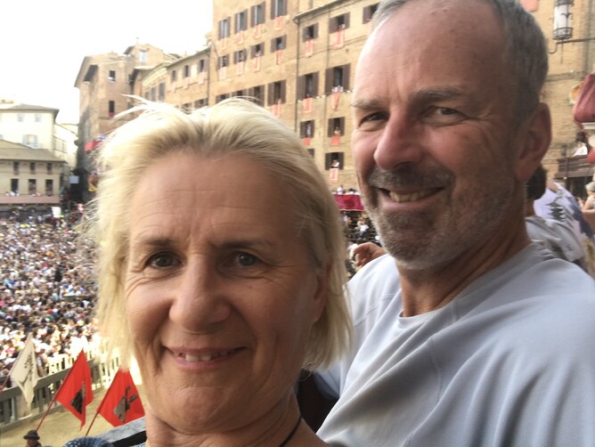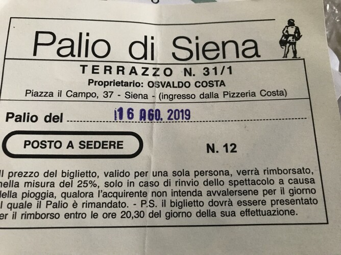 Bill gets quite heated about Istrice‘s jockey. He drew one but didn't start in that position, and missed the start. (We heard later the Istrice contrade got very angry with the jockey.)