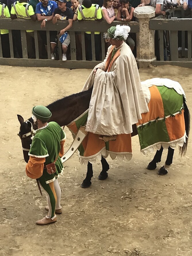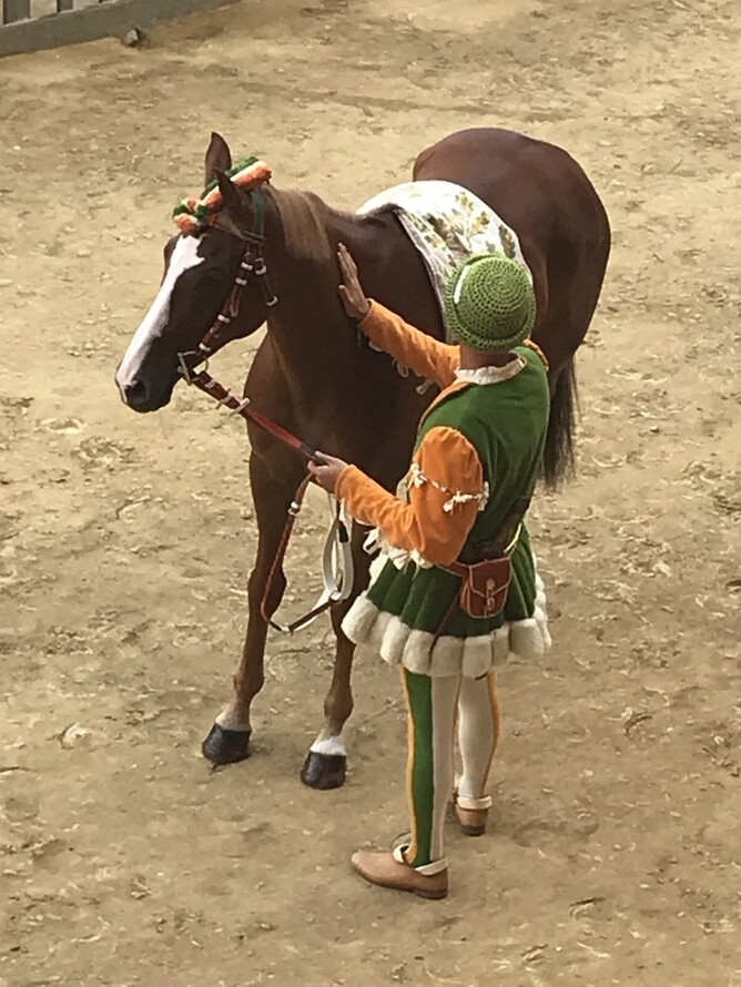 The fantini is in costume on another horse - this is the Selva fantini, Tittia. He is the upcoming new champion jockey - he has won 6 palio.