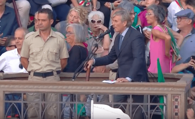 At 7 o'clock there is a big boom and the horses and fantini come out. After all the noise, there is then complete silence for 60 seconds when the starter/mossiere announces the draw.