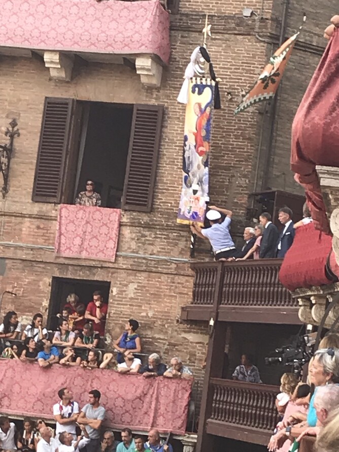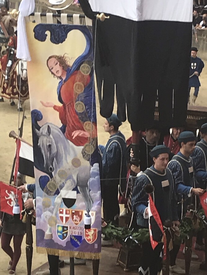 The palio! The winning contrade gets this. It is painted by a different (famous) painter each year.