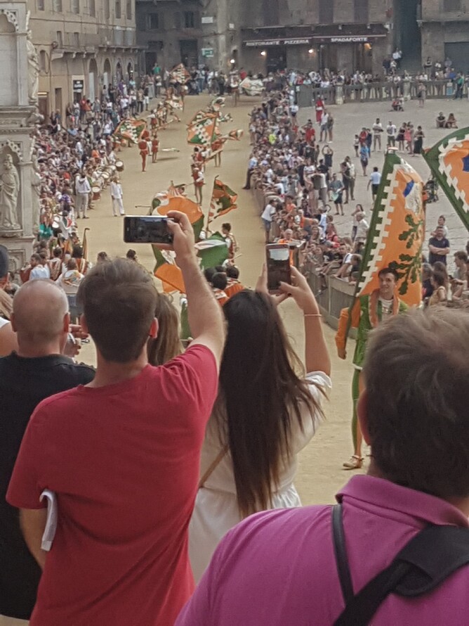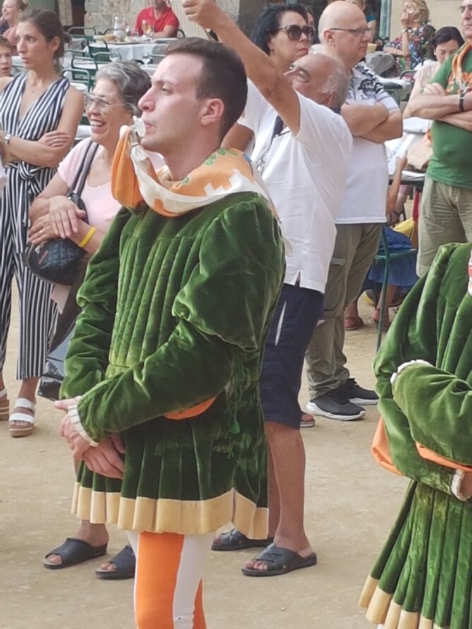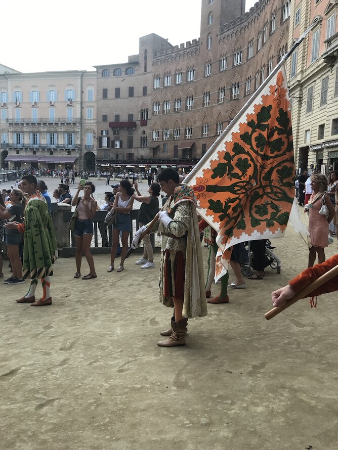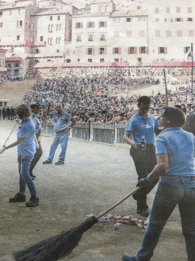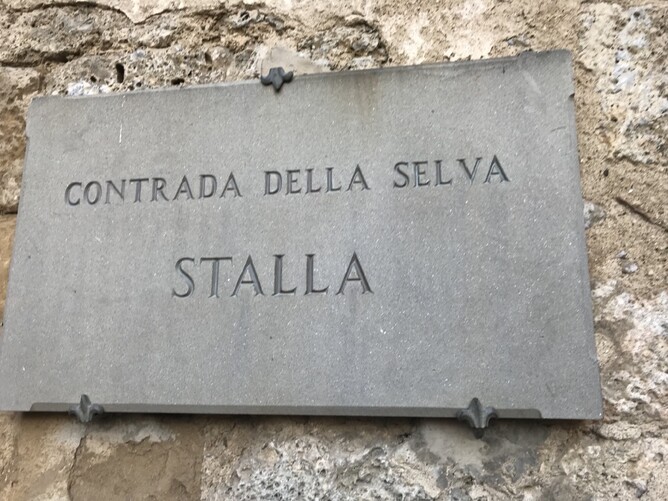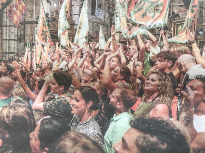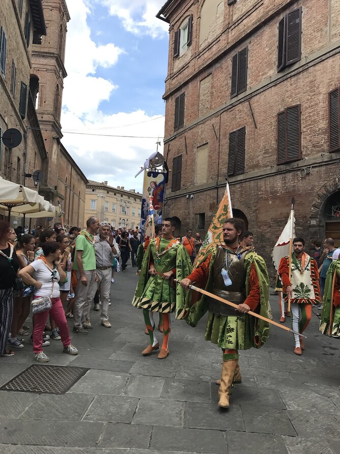 After your contrade wins, the next day you begin the 'tour' of solemn protectors and to the allied and friendly contrada with the compares, ensigns, drums, the Palio, and sometimes the winning horse and jockey, all escorted by various contrade members. Siena comes to resemble a playpen in which many of the toddlers have hairy legs. That night you start your victory dinners. You have as many dinners as Palios you have won. Selva/Forest have won 28 now. You have a BIG celebratory dinner in late September. Then more dinners beginning the following Sunday.