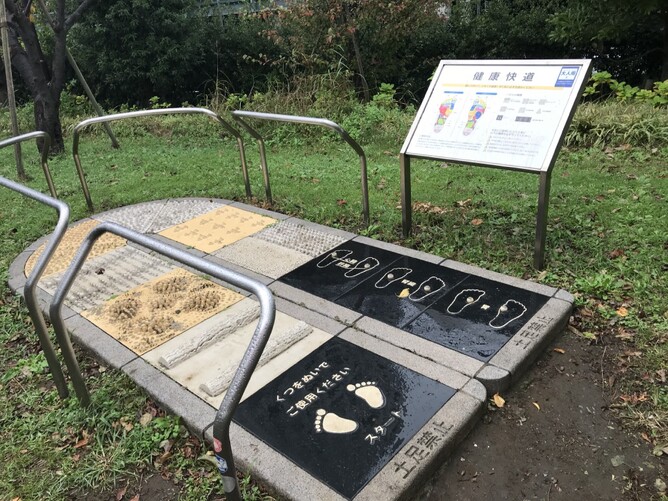 In the park below the buildings was this interactive foot platform. Feet can tell you everything. It was too wet to have a go.