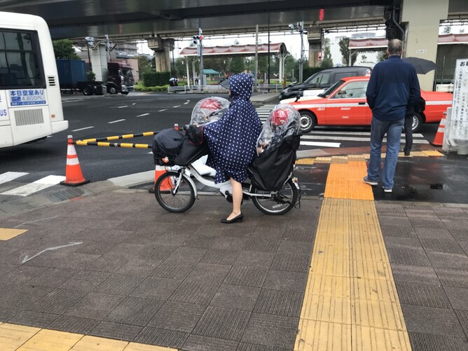 We checked into our hotel for one night, The Strings near Shinagawa. It started to rain but we went for a walk despite the rain.Here are some first sights of Tokyo - one child in the back and one in the front.