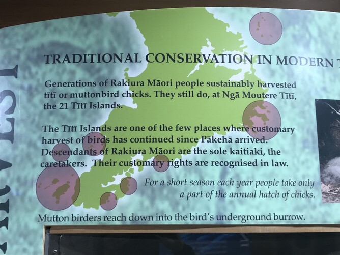 The visitor centre has very good information. I enjoyed learning about everything on Stewart Island. This about the mutton bird/sooty shearwater/tītī. Maoris still can hunt and eat it even though it is threatened. It is only the young 'teenage' chicks that taste ok we are told.