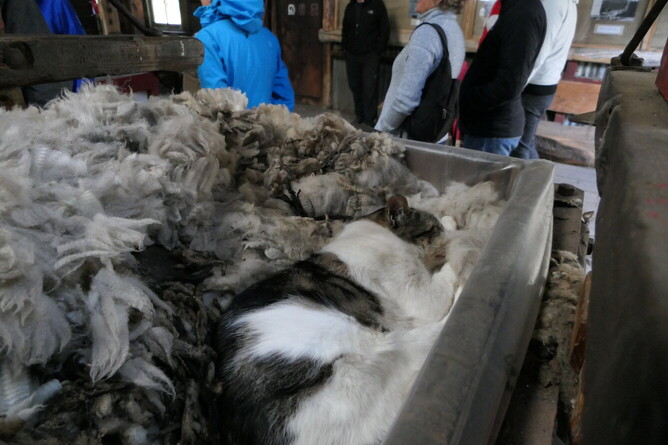 I think the joke here was the shearer playing with the sheep when he wasn't moving. I think I was photographing the cat at this point. I wanted to put it in because it is a good photo of Guy and Francesca(?).
