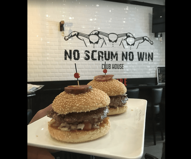 We had a fish burger at the No Scrum No Win bar and watched the rugby. It was fun and the rugby was interesting and the fish burger was average.