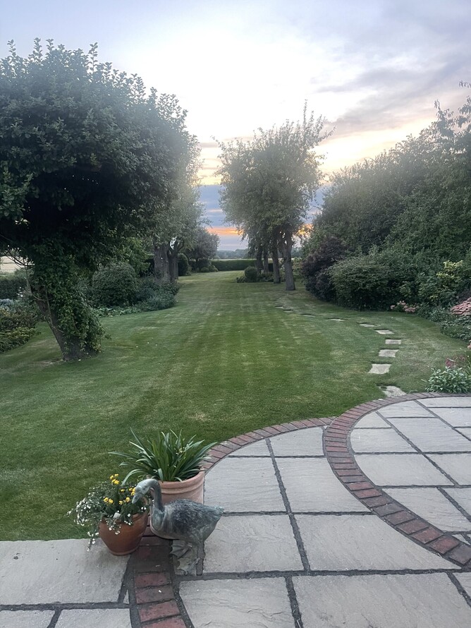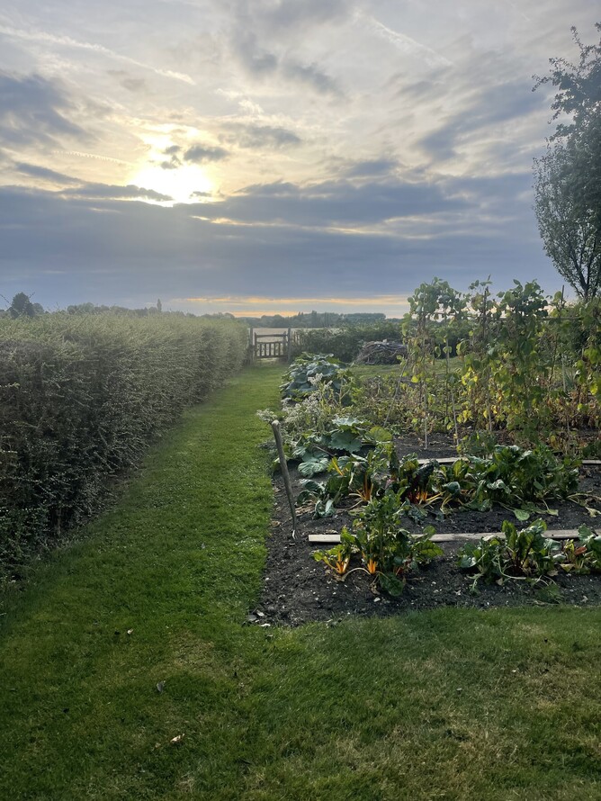 We return to Freddie and Simon's Orchard House in Mill Rd. We have a beautiful dinner cooked by Freddie, though Simon sometimes cooks he says. This is the sun setting over the garden.