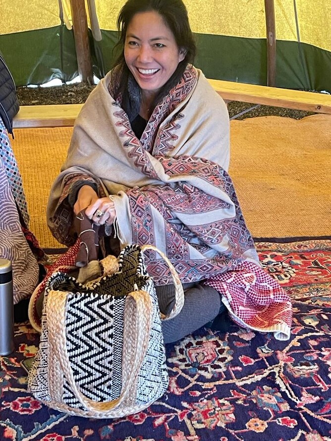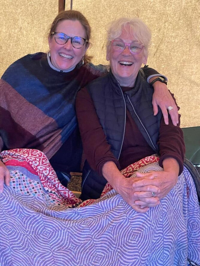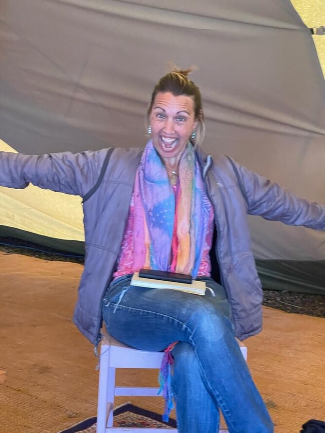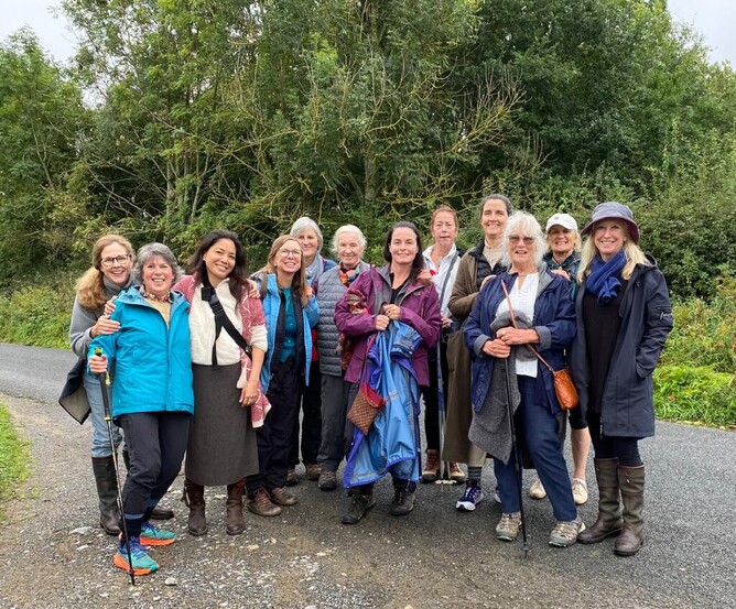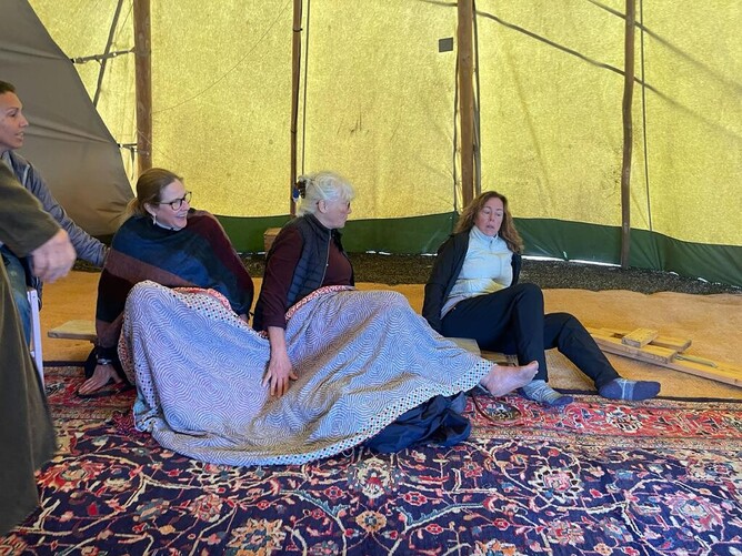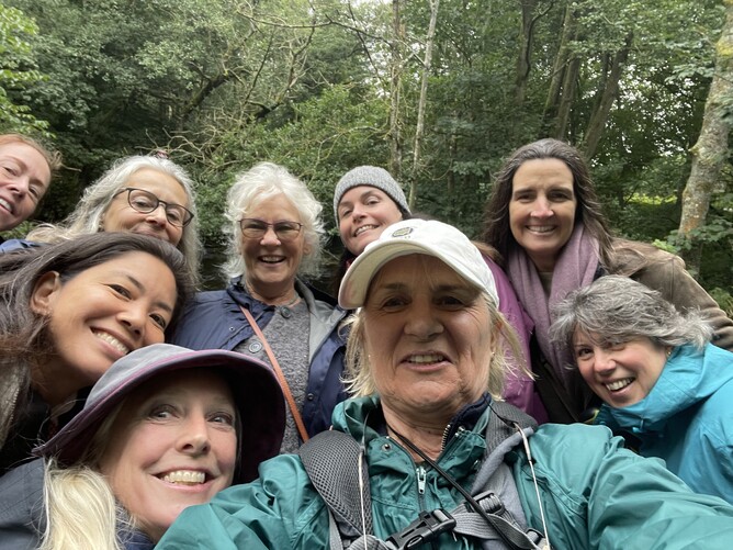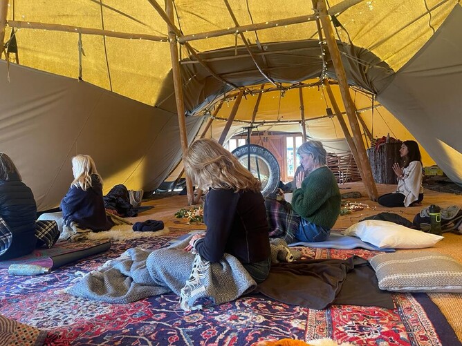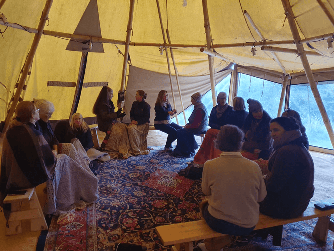 We head back to the teepee for a sound bath. Back row - Aileen, Liz, Sue, Jo and Ann . Front row Méme, Roz, me and Jane.