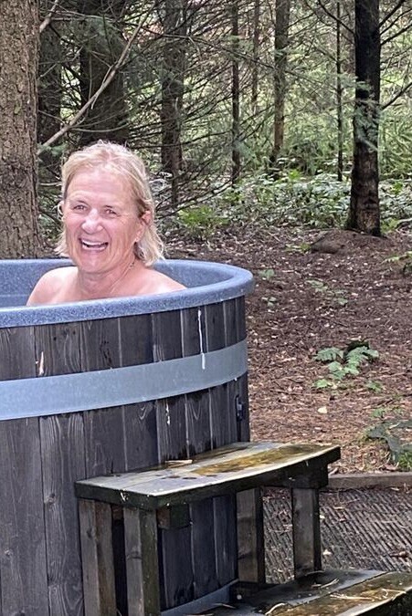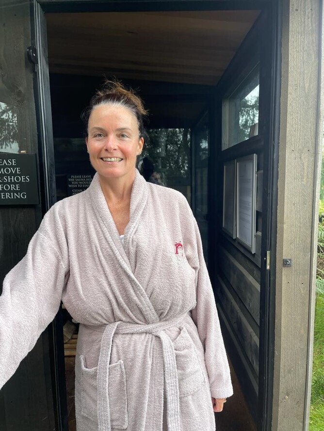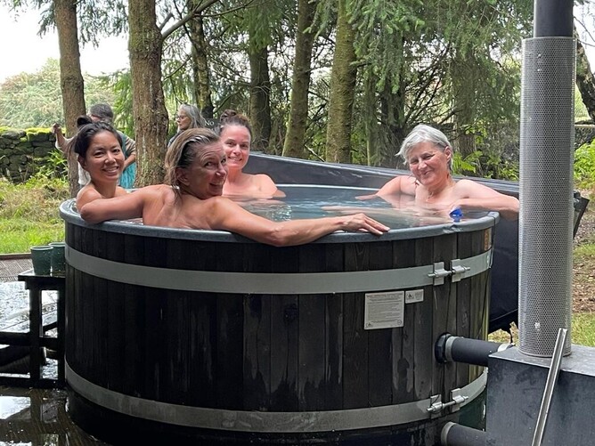 Then it is hot tub and sauna time. Jo, Julie, Catherine and Mémé.
