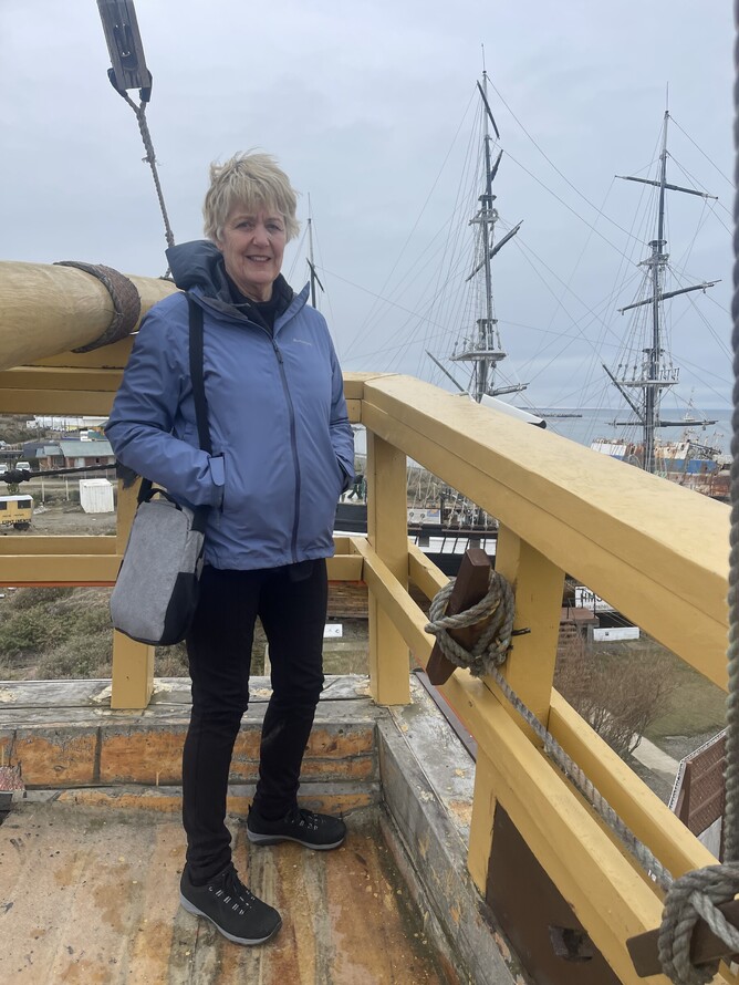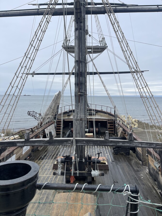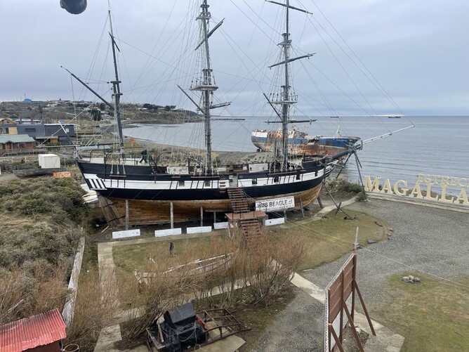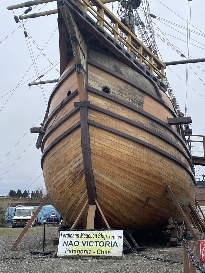 I go with Shauna, Sue and Charmian to the Nao Victoria Museum. This has replicas of important boats of Magellan’s history, such as the Nao Victoria, James Caird and the Goleta Ancud. It is 7.5 km north of Punta Arenas, and looks out at the Magellan Strait. It was opened in 2021.