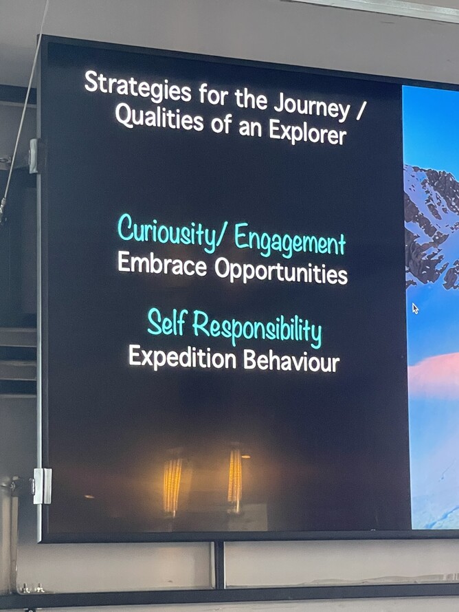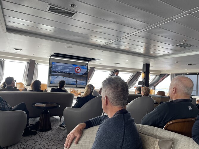 As our bags went to our room Hadleigh, our expedition leader, introduced himself. He welcomes us. His first slide is the ship at the top of this page. He is saying there will be a safety briefing after dinner. He will introduce staff later.
