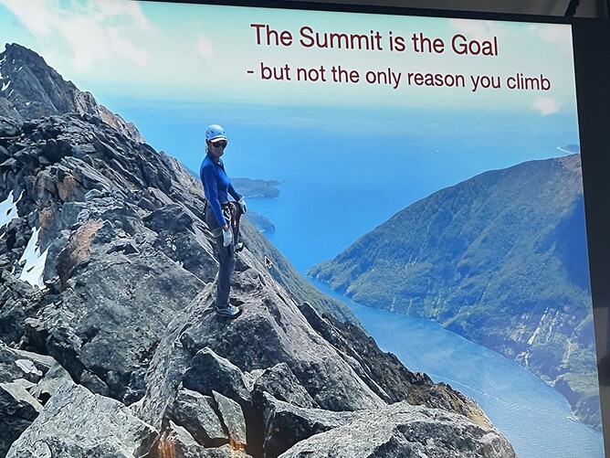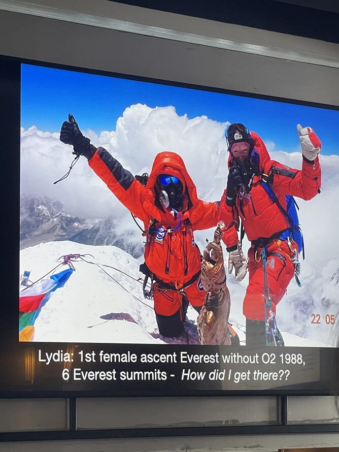After Marcel, we have Lydia's talk. Lydia was the 1st female to ascend Everest without O2, in 1988. She has completed 6 Everest summits. Amazing. Her talk was about how she got there.