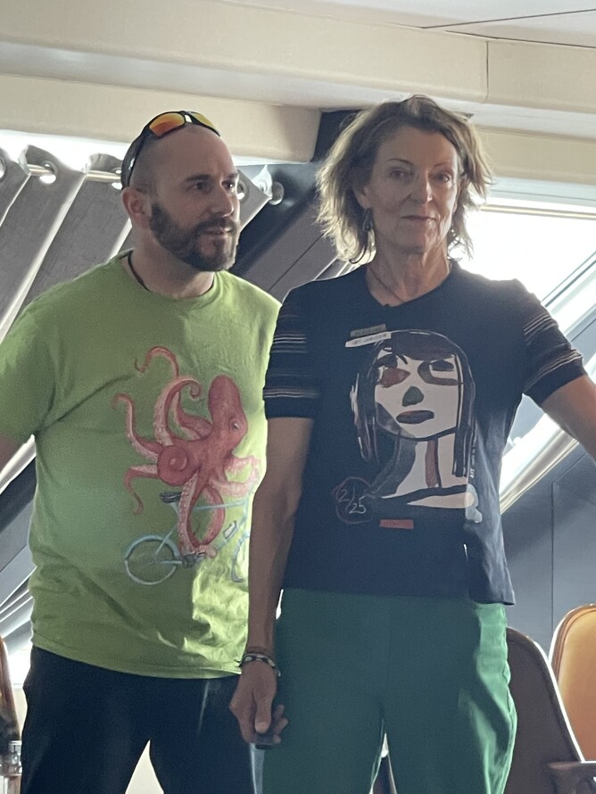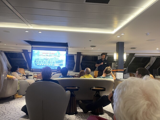 Hadleigh begins the talk by checking life jackets. He then tells us the layout of everything. He talks about the mudroom and shows a video. In the mudroom, he says to look for your cabin number. We see ours is the one shown on the video - cabin 423. Nice :).