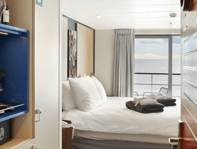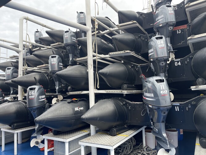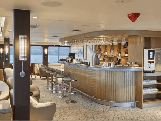 [From the website: "The ship features a glass-enclosed observation lounge and presentation room with state-of-the-art audio-visual equipment, a spacious and stylish dining room, a well-stocked bar, a library, a meeting room, a gym, a sauna, and a medical clinic. The forward-facing observation deck leads to the ship’s bow, which is accessible to guests to offer proximity to marine wildlife. The ship has a fleet of 10 Zodiac boats that are well suited for disembarking and wildlife watching.
