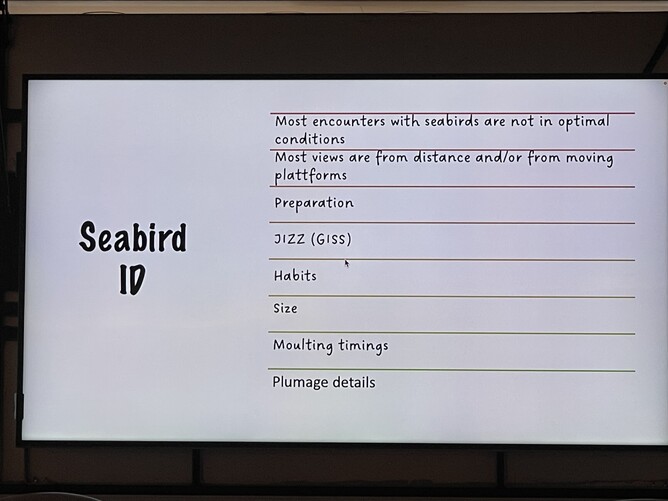 This might be easy for some I think! I love these SIMPLE ways to identify seabirds. (But I forget what GISS is.) Marcell is super succinct when he answers questions. I like his manner and he seems to know a lot. Here are his simple notes on slides.