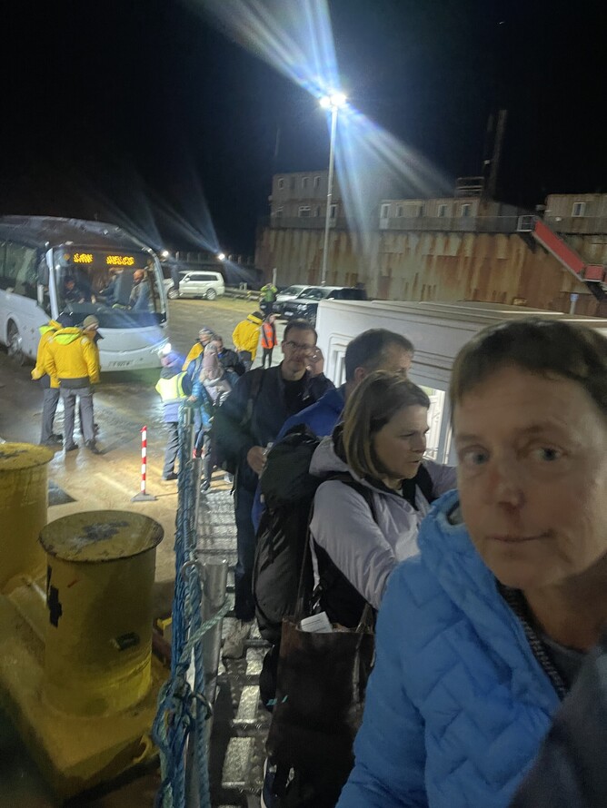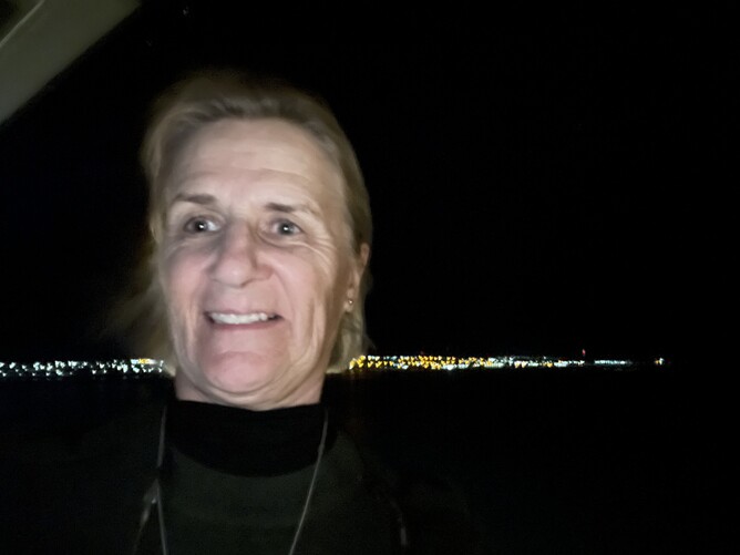 On the boat. I might look surprised here. Maybe I am. This boat is stunning. And I was struggling with taking a selfie on the deck. In the background, the lights of Port Stanley. (That is pretty much all of Port Stanley - the population of the Falklands is 3,200.)