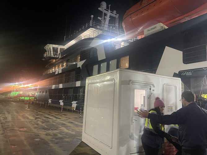 This is the Magellan Explorer. It is a new and modern expedition vessel custom-built for Antarctic cruises, called a "small ship", capacity ~80 guests.