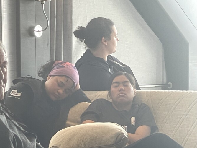 The boat can put you to sleep. It has been a big day. This is Georgie (at the back), Destiny and Porohu (two of the Inspiring Young Explorers on the trip).