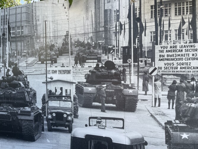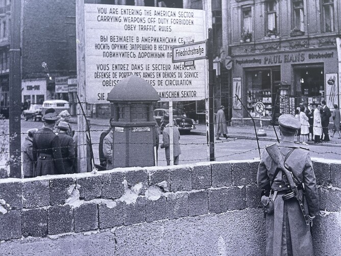 There was hardly any other place where the atmosphere of the Cold War was as frosty as at Checkpoint Charlie. The border crossing gained notoriety in October 1961 after the construction of the Berlin Wall: in the last days of October, American and Soviet tanks took up positions here after members of the US mission were asked to identify themselves at the GDR border post when passing through the Allied checkpoint. Soviet and Allied tanks faced each other with live ammunition and a third world war almost ensued. In the years that followed, the checkpoint was the scene of spectacular escapes which often ended in death."