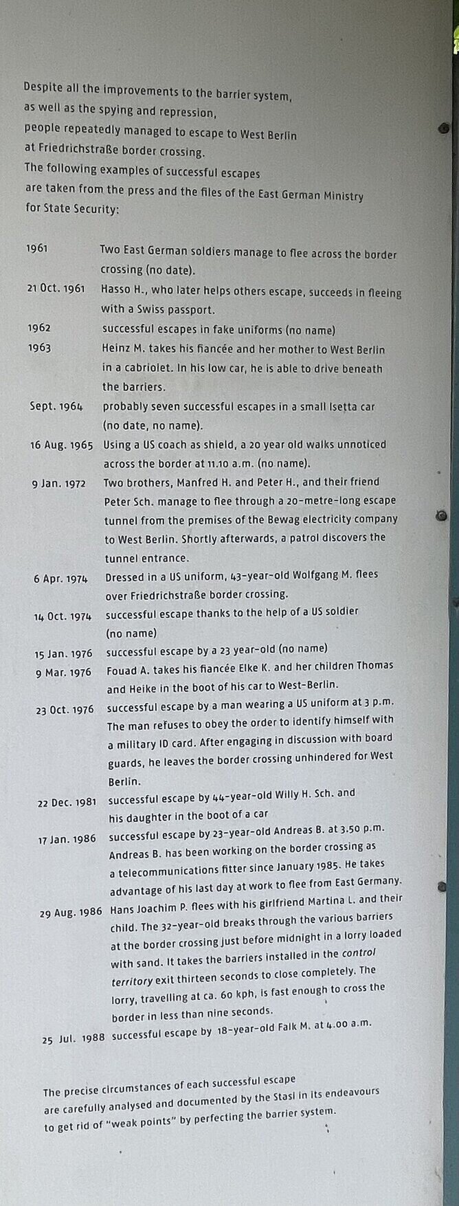 Here the human spirit has been crushed in the past but now there is a freedom that has emerged. People are very friendly and open. Germany does a good job of showing there is a way to acknowledge history, and acknowledge the horrors, and acknowledge the miracles (the escapes), and show the world they can move on.