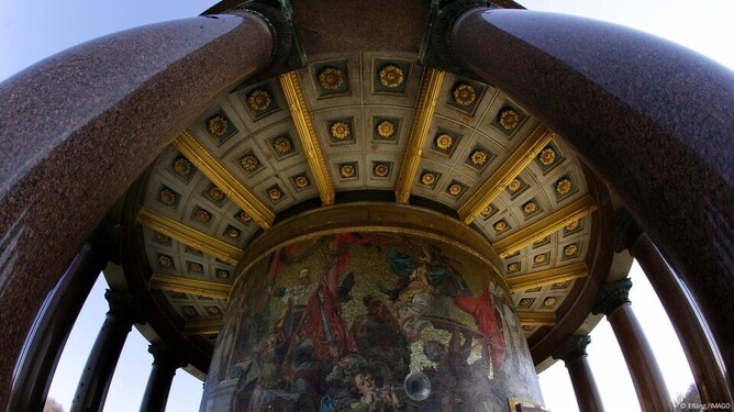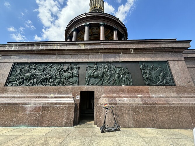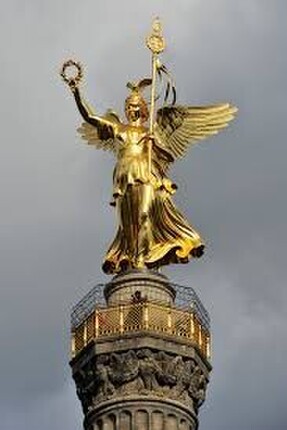 "The Victory Column was designed by Johann Heinrich Strack. Construction began in 1865 and took eight years. The winged sculpture of Goddess Victoria on top was designed by Friedrich Drake. The monument is meant to commemorate Germany's victories against Denmark, Austria and France between 1864 and 1871, a fact that is indicated by the sculpture's victorious pose as well as the gilded gun barrels on the columns and the mosaic by Anton von Werner in the colonnade."