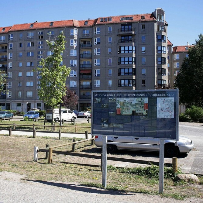 From https://www.atlasobscura.com/places/fuhrerbunker-parking-lot . "On January 16th, 1945 Adolf Hitler went underground. Until his eventual death about five months later, he would live in a bunker below the garden of the Reich Chancellery, a site that is now a (purposefully) unremarkable parking lot.