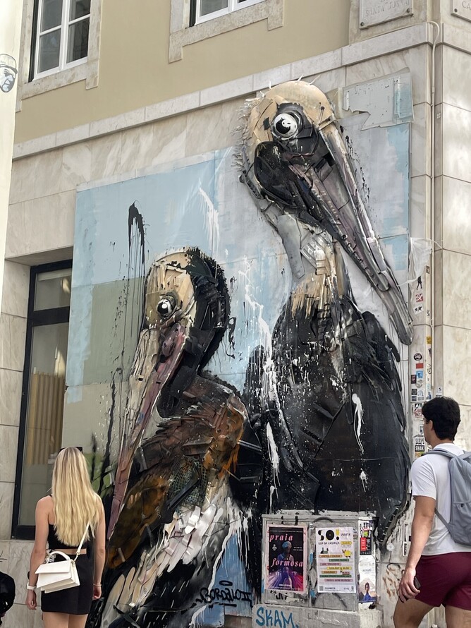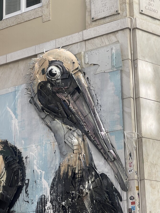 "Bordalo II's work is a prominent feature of Lisbon's street art scene, with his sculptures displayed throughout the city. He has been creating these pieces since 2012, transforming over 60 tons of recycled materials into two hundred animal sculptures. His art is a powerful commentary on environmental issues and consumption, highlighting the beauty and potential of materials often discarded."