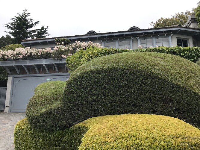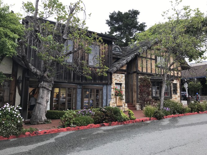 We did some exploring of Carmel-by-the-Sea - a quaint town which is similar to Princeton, with coffee shops and boutique type shops. The difference is Princeton has the university, Carmel-by-the-Sea has Pebble Beach Golf Course. It is a square mile village. There is a no high heels law, and there are no street addresses. Thirty years ago when Clint Eastwood was Mayor of Carmel he did not want to citify Carmel and rejected house- to-house mail delivery in favour of a central post office. (There are also no parking meters or street lights, and no sidewalks outside of Carmel's downtown commercial area.) Those seeking directions receive hints such as "fifth house on the east side of Torres Street, green trim, driftwood fence" or by the names adorning most houses, such as "Hansel" or "Sea Urchin." It is also bad luck to change the name on a Carmel cottage.