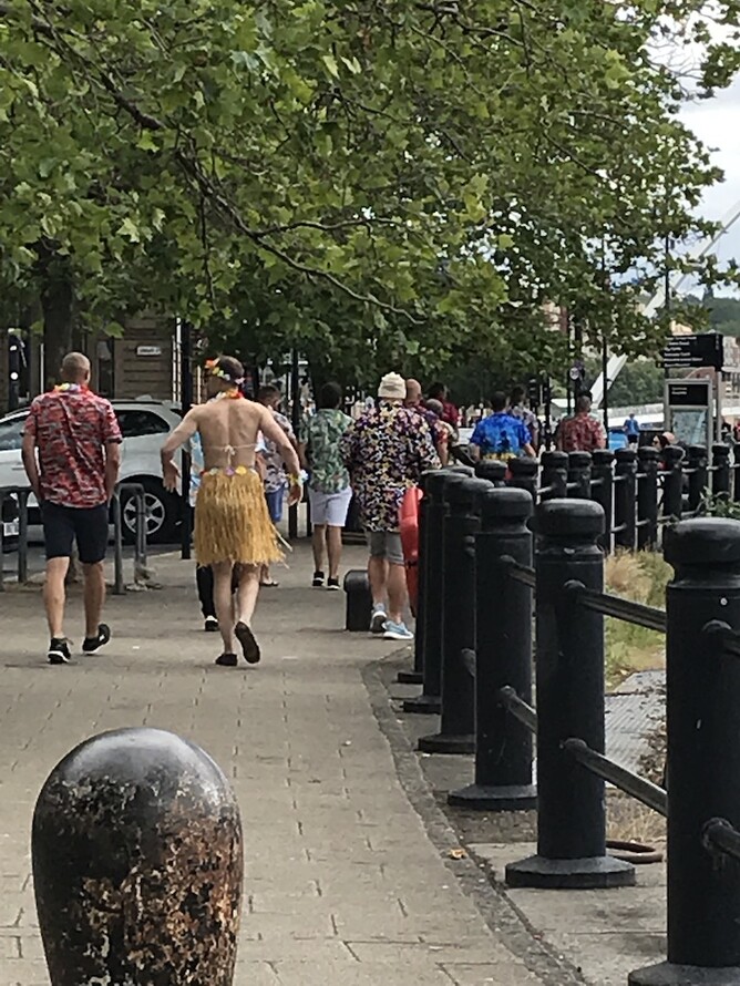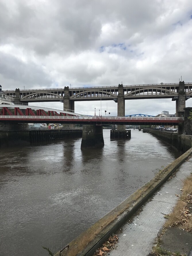 Newcastle is now a party town - we saw hen parties and stag parties everywhere. This is a stag party (walking along a path which wasn't there in Roman times).