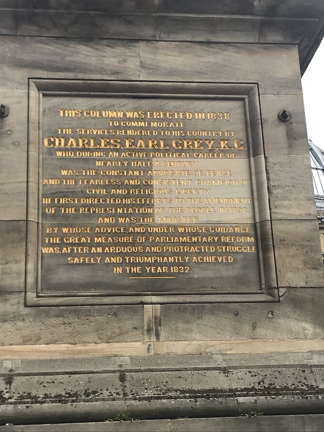 During his role as PM he reputedly received a gift, probably a diplomatic present, of tea that was flavoured with bergamot oil. He liked it so much and It became so popular that he asked British tea merchants to recreate it. They did and it became an instant hit. He did not get any royalties for it. Earl Grey Tea is big today. Some other hero was destined for this monument, and I can't remember why he didn't - some divide in the city at the time. Anyway Charles became Earl Grey and the monument was for the transformation he had caused for others.