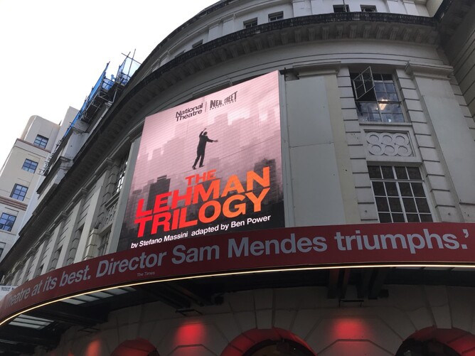 Part of the Guardian review of the show: "Michael Billington says what an astonishing evening! Spanning 150 years and running three and a half hours, Stefano Massini’s play traces the trajectory of western capitalism by following the fortunes of a single family. But where previous European stagings have deployed a vast cast, Sam Mendes’s production of Ben Power’s adaptation uses just three actors: Simon Russell Beale, Ben Miles and Adam Godley. The result is an intimate epic that becomes a masterly study of acting as well as of the intricacies of high finance. For most of us, the name Lehman Brothers stirs memories of the financial crash of 2008, when this Wall Street institution filed for bankruptcy: an event with global consequences. But Massini’s play traces the family’s progress from the arrival of three brothers from Bavaria in the America of the 1840s. Starting modestly with the opening of a general store in Montgomery, Alabama, they move into buying and reselling raw cotton and expand into banking, coffee and the burgeoning railway business. Power passes from one generation to the next, but there is a decisive shift in the late 1960s with the creation of a trading division run by non-family members. Eventually it leads to the firm’s demise with the collapse of the mortgage bond market."