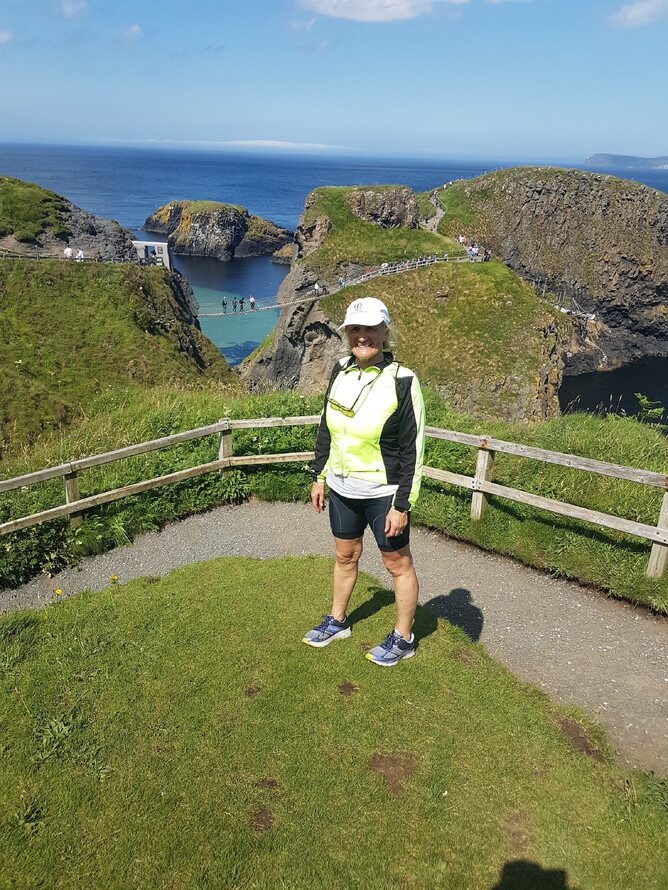 Then it was cycling to Carrick-a-Rede (a hole in the rock). A rope bridge 100 feet above the sea was erected here by fishermen in 1803 so they could check their nets for salmon. Men would round the salmon up around the coast by boat, when the salmon were running, and then fishermen throw their nets out by boat. The salmon dried up by 2002. In the 1960's almost 300 fish were caught a day, now there are none. Lots of tourists though.