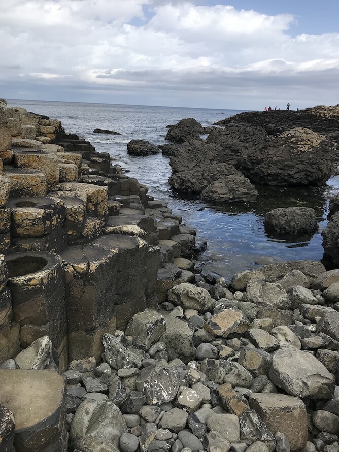 These perfectly geometric rocks came out of a volcanic eruption. There are 40,000 basalt columns. This was formed 50-60 million years ago - when rocks from the lava flow hit the sea, this is what happened.
