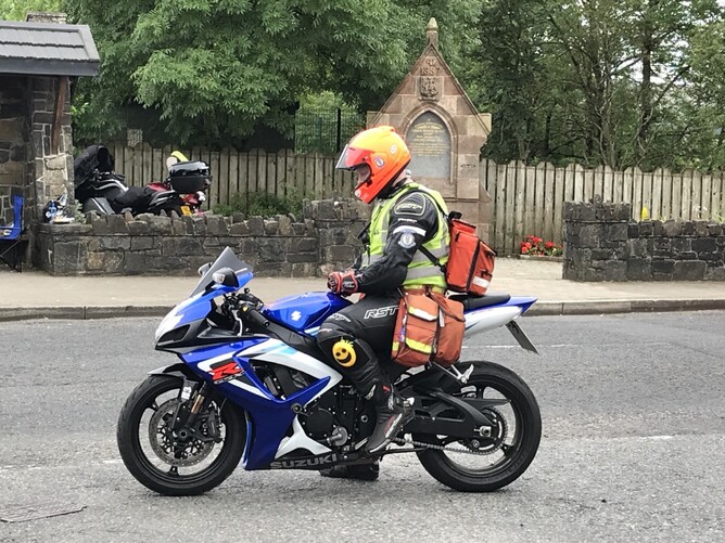 Then all sirens and the race was stopped. There was an accident. Just beyond where this biker was. (The track is 3.3 miles long.) This is another medic on bike, though it seemed the biker needed more attention than he could give. He went to hospital.