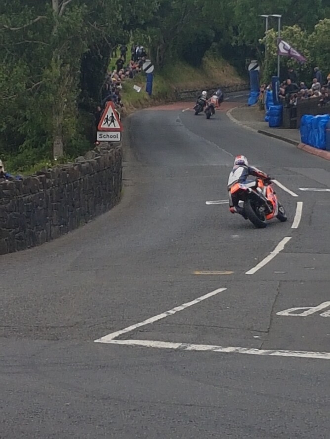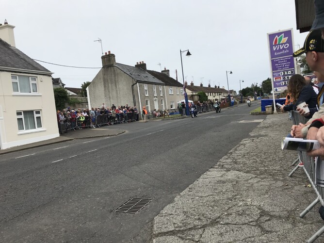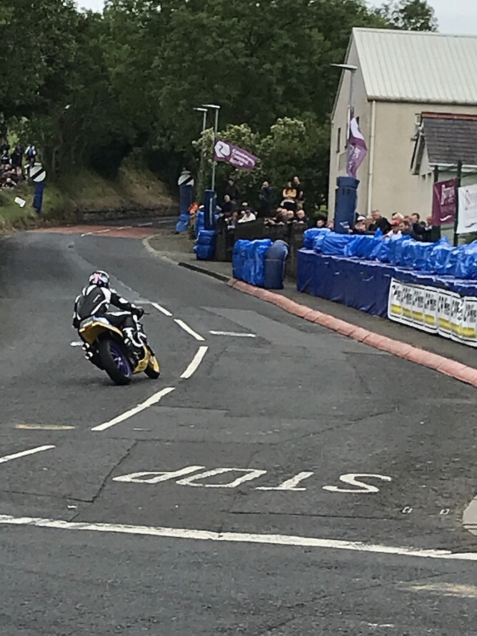 A local boy from Ballymena Neil Kernohan won on a McCloy Kawasaki. Race 9, we moved for a better view.