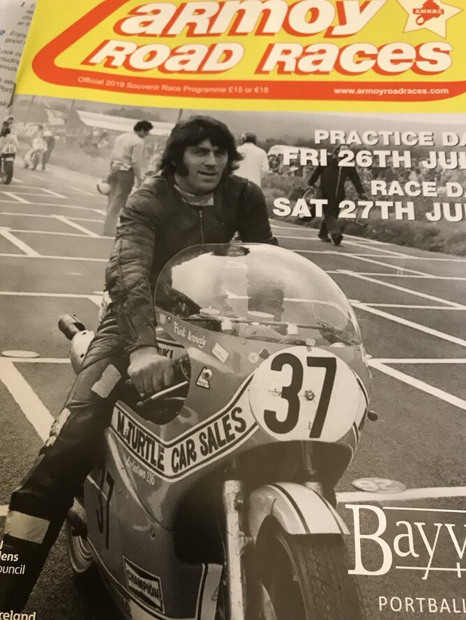 We bought a programme. This is Frank Kennedy on the cover. He was part of the "Armoy Armada" who helped put the tiny Antrim village of Armoy on the map. The village population is 700 and Frank along with Joey and Jim Dunlop and Mervyn Robinson' all from Armoy, won 250 motorcycle racing trophies between them. Joey Dunlop won 26 races at the Isle of Man TT races, which Bill knows quite a lot about because the Kermodes came from the Isle of Man. In the programme it says the "Armoy Armada" sails despite injuries. And at a price! It occurs to me like this - motorcycling is incredibly dangerous and exhilarating, and addictive, and I am not about to take it up.