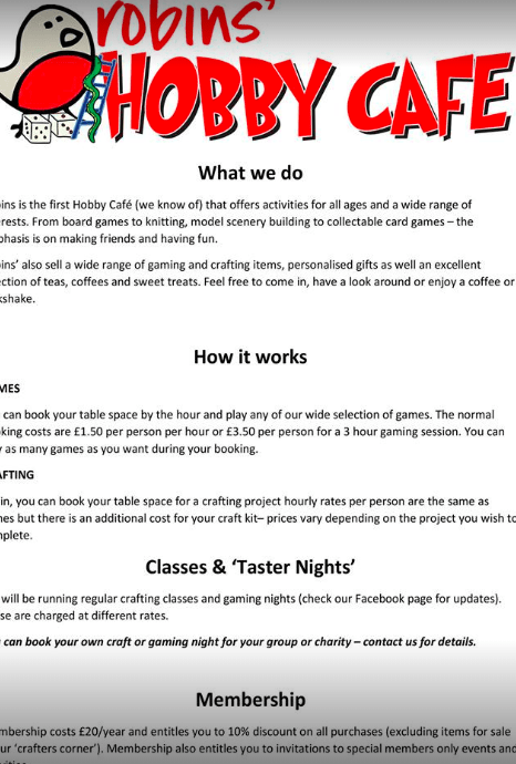Dropped Bill off at Robin's Hobby Cafe. It really was my kind of cafe, with board game playing and the right name! I think Bill was the only one there, but at times it can get busy. A picture from their Facebook page.