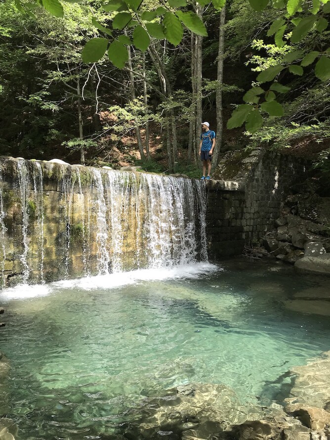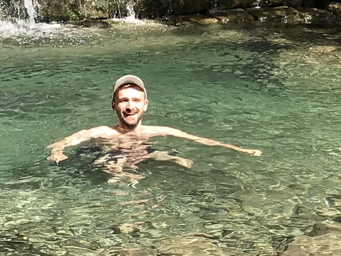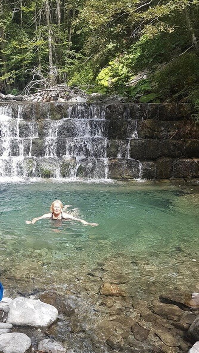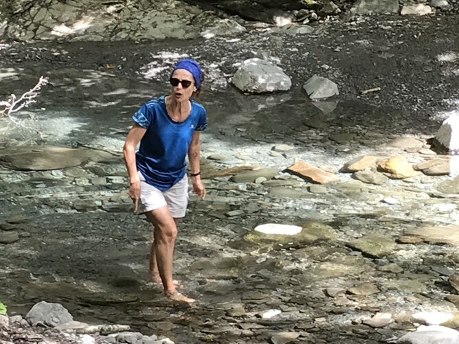 Manuela goes to dip her feet in an icy stream.