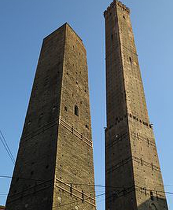 In medieval Italy two wealthy Bologna families competed to build the highest tower. One did, and the other gave up. The queue was too long so we did not climb to the top of the tallest tower which you can do. It is 97.2 meters, the tallest leaning tower in Italy. (Both these lean.)
