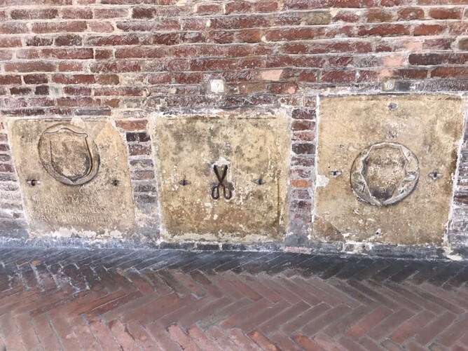 We went for a wander. These symbols are significant to trades in medieval Bologna. The scissors are a symbol of the cloth trade in early times. The other two I tried to look up and could not find.