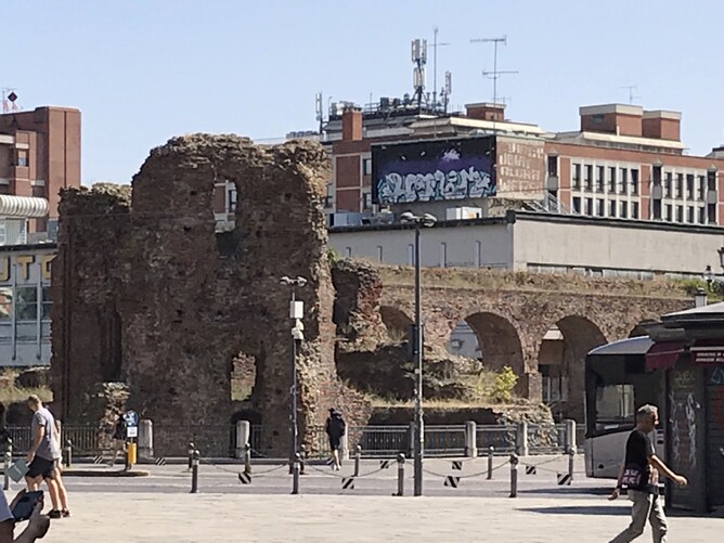 We take the rental car back to he airport, and bus into the train station of Bologna ready for our tour of Bologna. This is the only part of the city wall left. It used to surround Bologna.