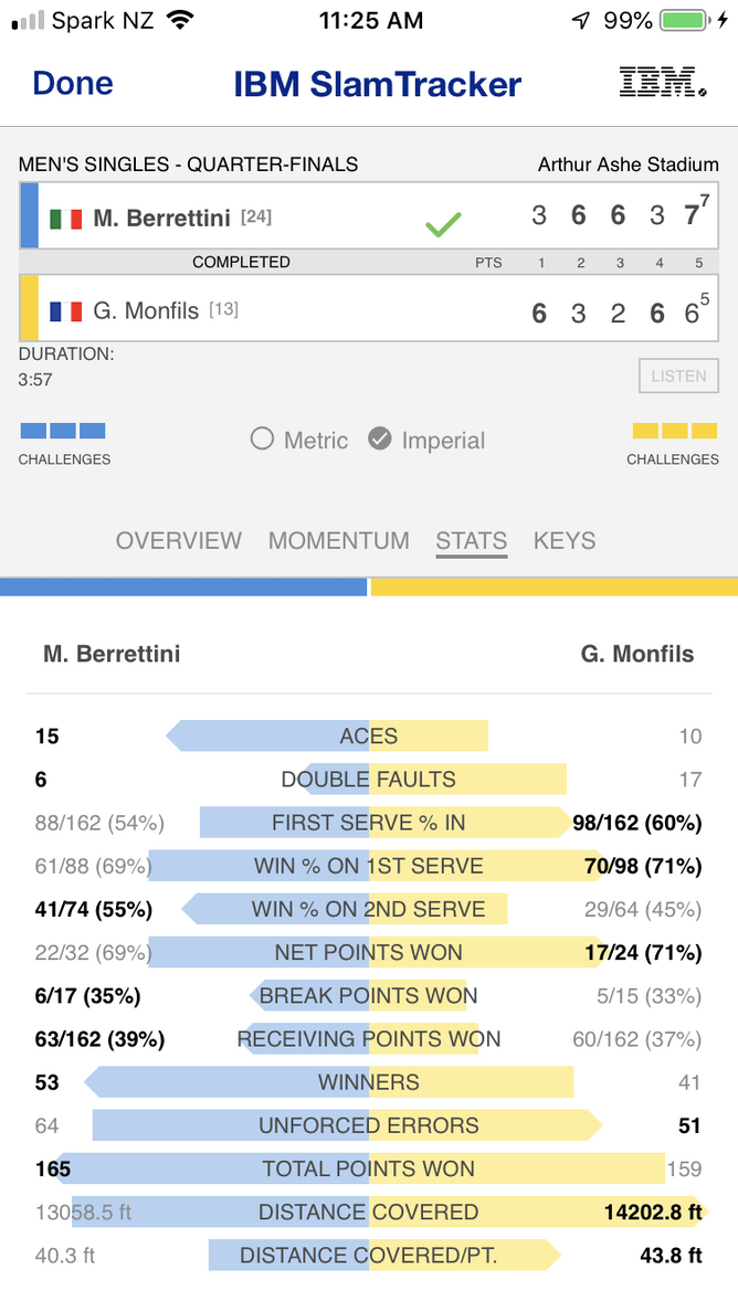 The second game we watch is Matteo Berrettini from Italy v Gael Monfils from France. After reading yesterday's article I have my favourite. See if you can guess who? This game was rated the best game of the tournament to that stage, and it was definitely the best game we saw - 4 hours and won in a tiebreaker in the fifth set.