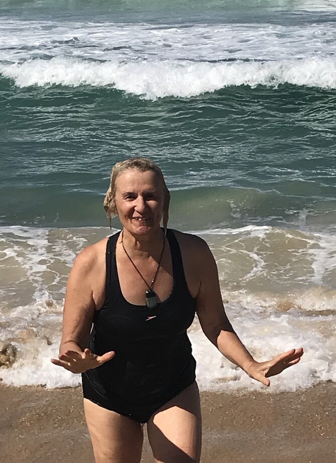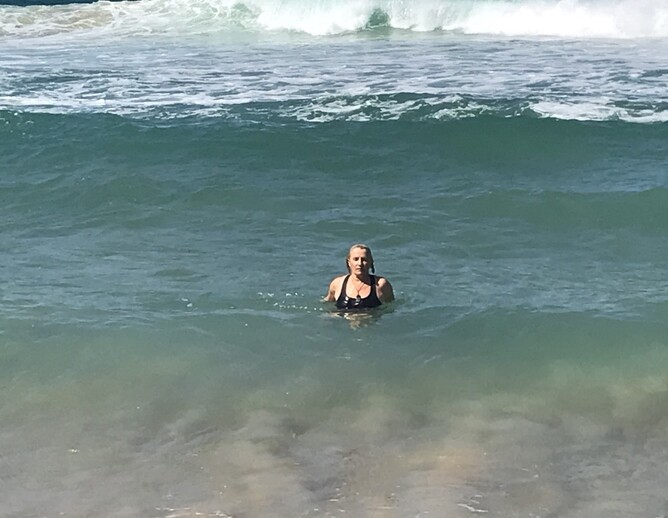 We walk to the surf lifesaver flags. I swim in between the flags. Mary doesn't have her togs. Mine were underneath my shorts and top.