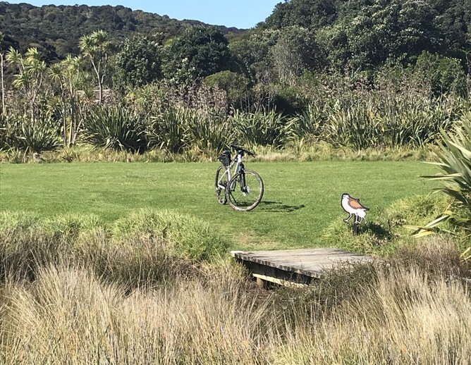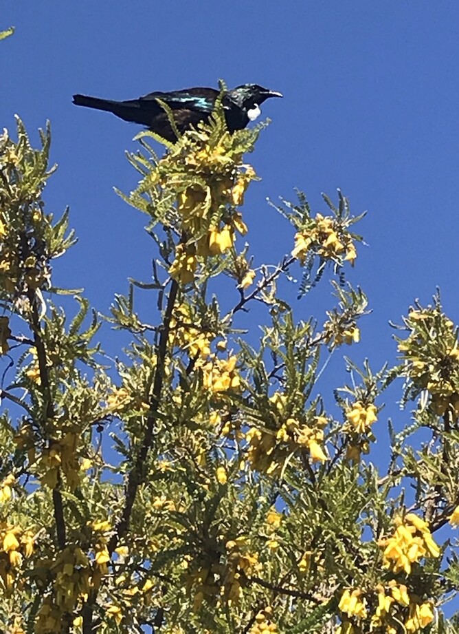 I head off on a bike ride to one of our favourite places on Waiheke. We go past the sports ground and I am awed by the kowhai's in flower and this tui.