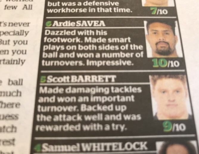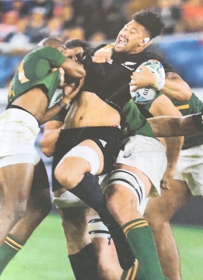 The All Blacks play South Africa in RWC in Japan. It was a thriller. NZ 23 - SA 13. It was SA for the first 20 mins and then NZ got the upper hand. Ardie in this photo has no fear and tackled relentlessly. This in the paper the day after.