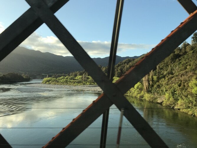 We left Hokitika after the NEXT Forum (the day before this) and drove to Murchison to stay the night in an Air Bn'b we had booked. It was a 2 1/2 hour drive. Murchison is close to Inangahua Junction, where they had a big earthquake in 1968. This bridge crosses the mighty Buller River.